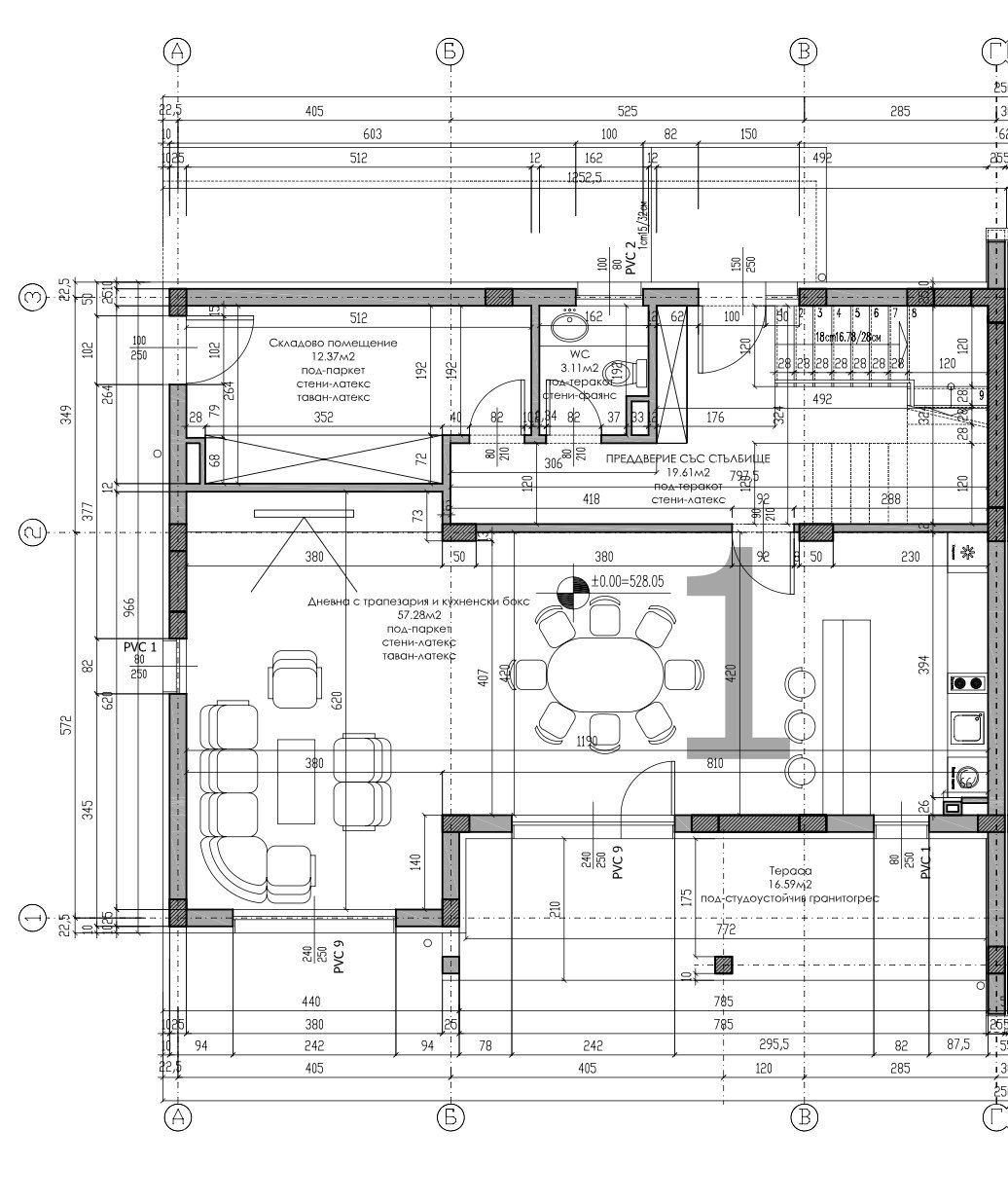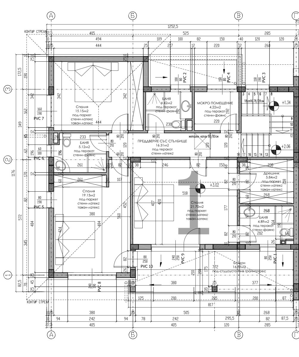 • Walls and ceilings: machine-made gypsum plaster; in wet rooms – lime-cement plaster.
